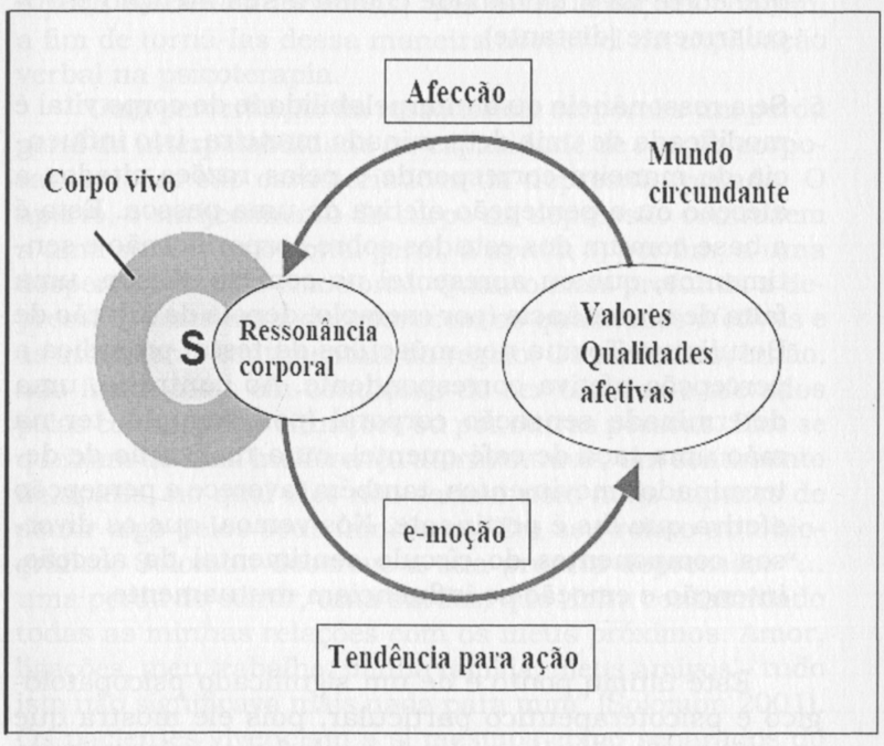 3. Sobre esta base, sentimentos podem ser compreendidos como interações circulares ou como laços de feedback entre um componente centrípeto-afetivo e um componente centrífugo-emotivo, em suma, entre “afecção” e “emoção” (cf. esquema 1). Ser afetado pelos valores, valências ou qualidades afetivas de uma situação, ou seja, ser tocado por eles, desencadeia uma ressonância corporal (“afecção”), que, inversamente, influencia a percepção emocional da situação e envolve uma prontidão correspondente para a ação (“e-motion”). O sentimento (ou a intencionalidade afetiva) consiste no acontecimento circular interativo conjunto, que é mediado pela ressonância do corpo que sente.