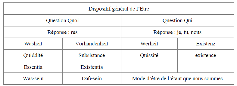 Être se trouve dans le fait d’être [Quoddité, Dass] et dans le fait d’‘être tel’ [Quiddité, Sosein], dans la réalité [Realität], dans la présence [Vorhandenheit] [1], dans la consistance [Bestand], dans la valeur [Geltung], dans l’existence [Dasein]a, dans le « il se donne » [es gibt]. [SZ GA2
